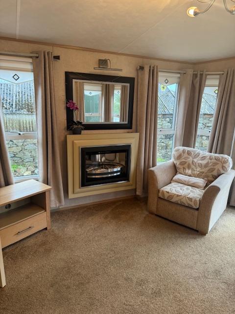 Separate lounge with patio doors, free standing suite and electric fire.